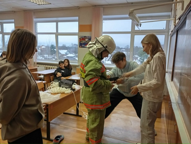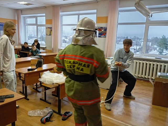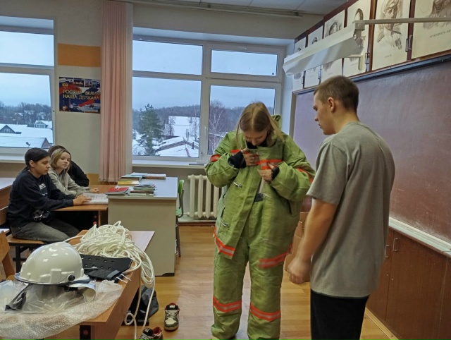 Ребята из Дружины юных пожарных Савинской средней школы Новгородского района осваивают вязание пожарных узлов, одевание боевой одежды пожарного и двойную скатку пожарного рукава.
