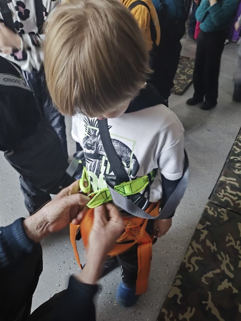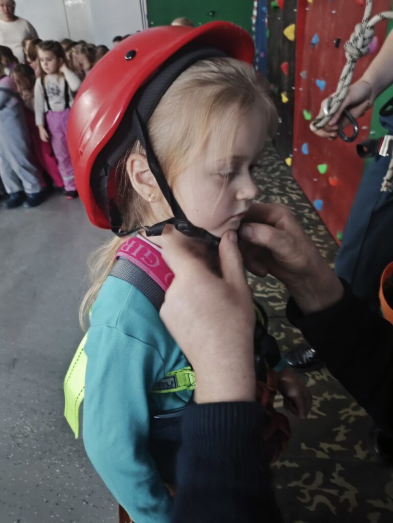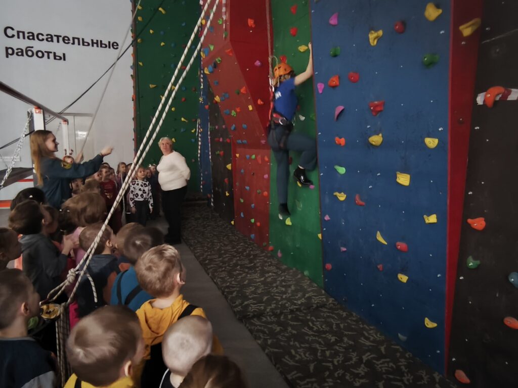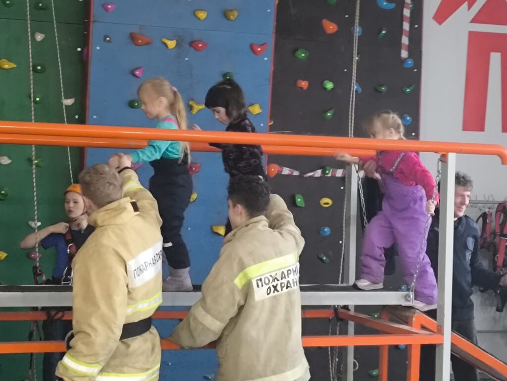 А дальше в ход пошли веревка по вязанию узлов для спасения человека, каски пожарные, подвижная дорожка и скалодром! Вот, где было много эмоций! Особенно у тех, кто смог сам попробовать себя на нем.